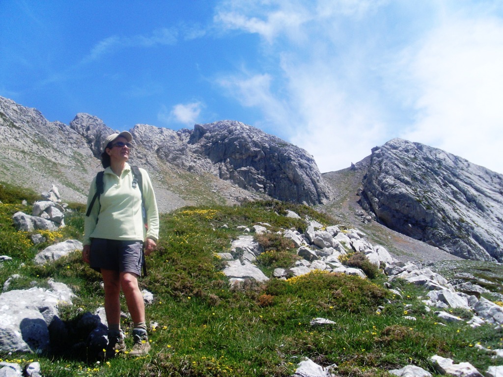 Bajamos buscando una alternativa más suave y vamos hasta la collada del Muñón. Luego ya seguimos bajando haca la majada Llagüezos y la Cueta. Detrás de Aurora se aprecia bien la canal de subida y la cumbre.