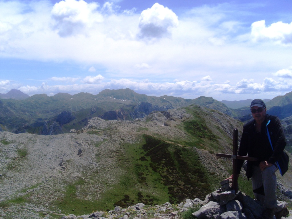 Desde la cumbre orientada al sur se ve cómo continúa la peña hacia el collado las Cruces; a lo lejos la silueta de las cumbres del circo de Peña Orníz y su compañía; a la izquierda del todo, más lejana, Peña Ubiña.